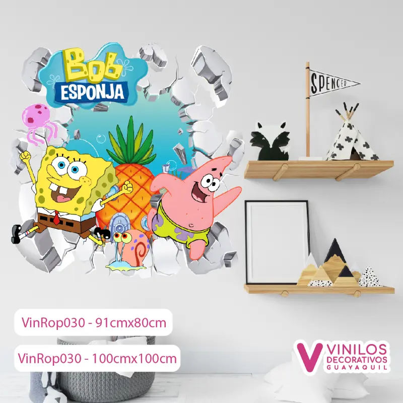 ¿Tu pequeñ@ se muere de risa con las ocurrencias de la esponja más alegre de Fondo de Bikini y su estrella de mar favorita? Ahora Bob Esponja y Patricio, el dúo más querido y divertido del fondo del mar, pueden saltar de la pantalla y convertirse en parte de su espacio. Nuestros vinilos con efecto «rompe pared» crean la ilusión de que los mejores amigos están literalmente saliendo de la pared, listos para llenar su habitación de risas, aventuras y la mejor actitud positiva.