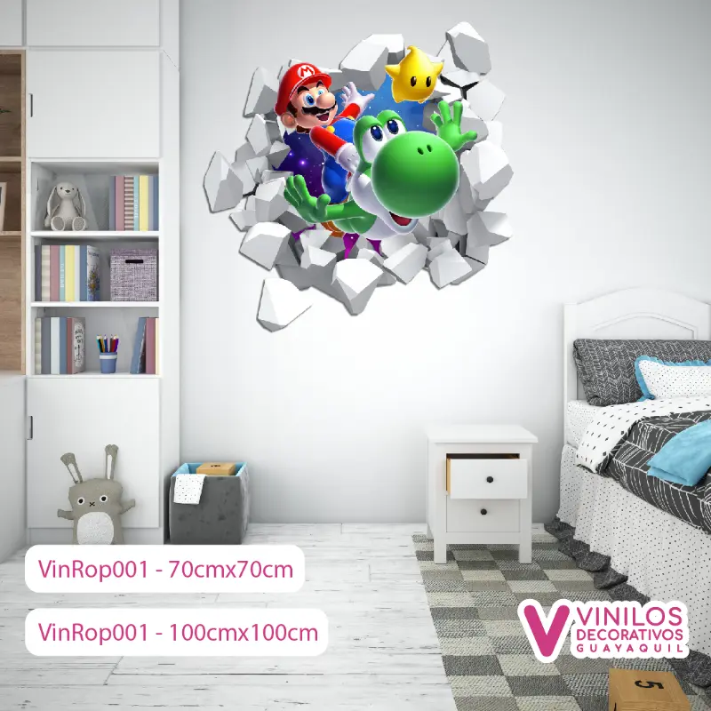 ¿Tu pequeñ@ (o el niño que llevas dentro) creció saltando por el Reino Champiñón junto a Mario y su fiel amigo Yoshi? Ahora la magia del videojuego más querido de todos los tiempos puede saltar de la pantalla y convertirse en parte de su habitación. Nuestros vinilos «rompe pared» crean la ilusión de que Mario y Yoshi están saliendo de un bloque, una tubería o un ladrillo, justo en su cuarto.